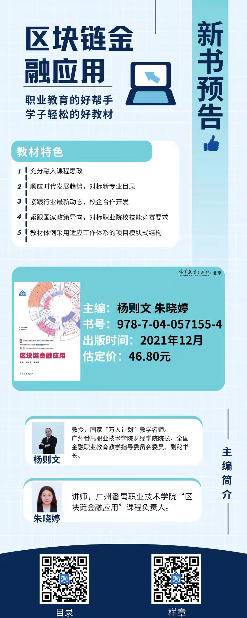 本教材是由國(guó)家“萬(wàn)人計(jì)劃”教學(xué)名師楊則文教授帶隊(duì)、校企合作編寫(xiě)的項(xiàng)目式立體化教材《區(qū)塊鏈金融應(yīng)用》。由高等教育出版社出版發(fā)行,是高等職業(yè)教育財(cái)經(jīng)類專業(yè)群數(shù)智化財(cái)經(jīng)系列教材;也是高等職業(yè)教育金融類專業(yè)“崗課賽訓(xùn)”融通系列教材,并將于近期上市發(fā)行。