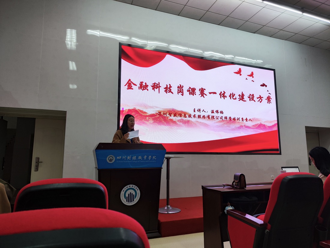 我司(深圳智盛信息技術(shù)股份有限公司)師資培訓(xùn)負(fù)責(zé)人溫偉楠開展金融科技應(yīng)用教學(xué)訓(xùn)創(chuàng)一體化建設(shè)方案講座。講師溫偉楠主要從“銀行業(yè)務(wù)綜合技能賽項的發(fā)展歷程”“金融科技應(yīng)用教學(xué)訓(xùn)創(chuàng)一體化建設(shè)思路”兩個方面分別做出分享。