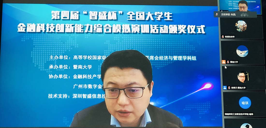 2021年12月4日,由高等學(xué)校國家級(jí)實(shí)驗(yàn)教學(xué)示范中心聯(lián)席會(huì)經(jīng)濟(jì)與管理學(xué)科組主辦;暨南大學(xué)承辦;金融科技產(chǎn)學(xué)協(xié)同創(chuàng)新聯(lián)盟和廣州市數(shù)字金融協(xié)會(huì)協(xié)辦;深圳智盛信息技術(shù)股份有限公司作為技術(shù)支持的第四屆“智盛杯”全國大學(xué)生金融科技創(chuàng)新能力大賽頒獎(jiǎng)儀式正式收官。此次頒獎(jiǎng)儀式采取線上方式通過以騰訊會(huì)議直播的形式參加。