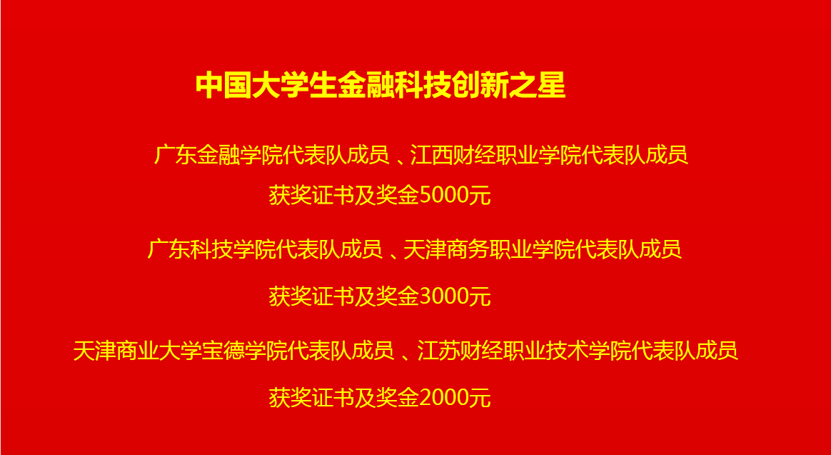 今年與往屆不同的是特增加了企業(yè)招聘宣講活動(dòng),針對(duì)金融科技人才緊缺結(jié)合人才培養(yǎng)要求,促進(jìn)教學(xué)改革,為本次優(yōu)秀人才提供實(shí)習(xí)就業(yè)機(jī)會(huì),同時(shí)也為各大院校與企業(yè)零距離提供交流機(jī)會(huì),讓更多院校了解企業(yè)對(duì)復(fù)合型人才的要求,助力打通人才培養(yǎng)與人才輸送通道。最后讓我們一起來看下獲獎(jiǎng)名單吧~