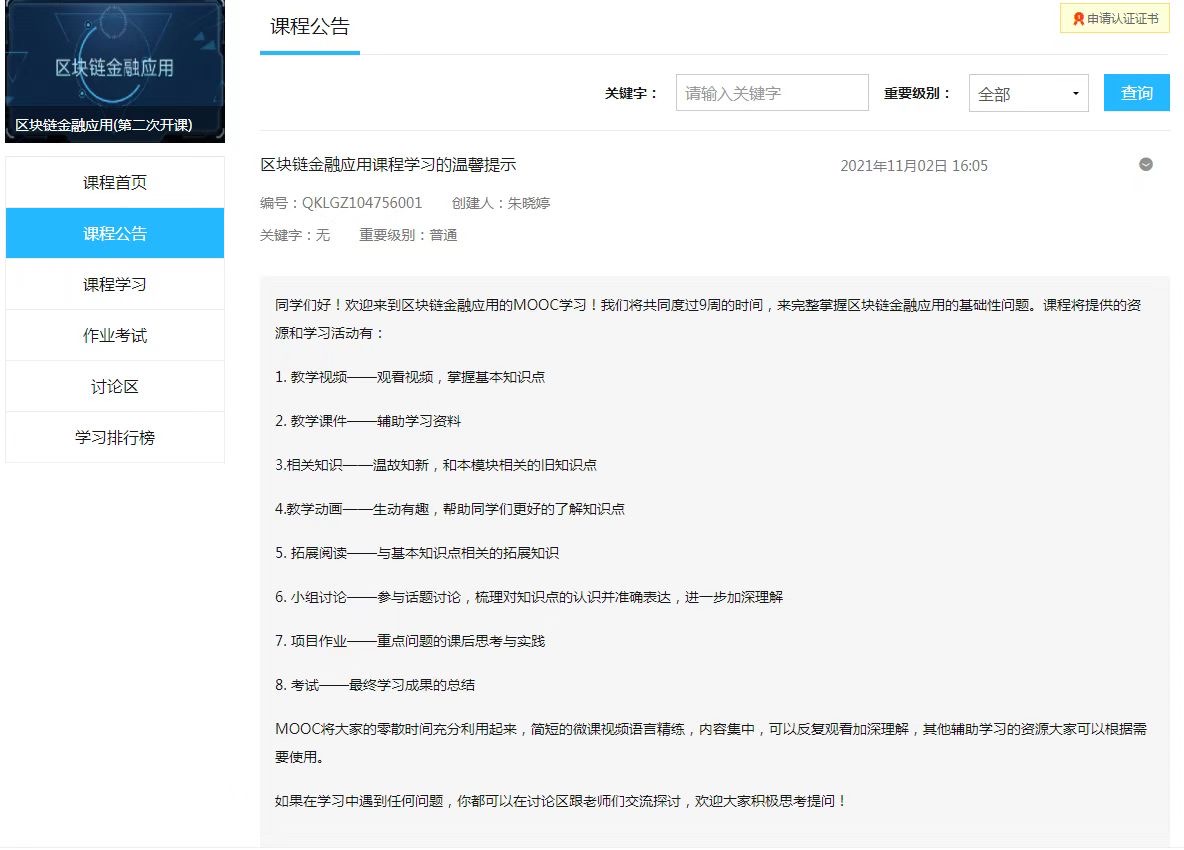 為落實(shí)中央部署,教育部于2020年4月30日發(fā)布《高等學(xué)校區(qū)塊鏈技術(shù)創(chuàng)新行動(dòng)計(jì)劃》(以下簡(jiǎn)稱《行動(dòng)計(jì)劃》),文件要求“到2025年,在高校布局建設(shè)一批區(qū)塊鏈技術(shù)創(chuàng)新基地,培養(yǎng)匯聚一批區(qū)塊鏈技術(shù)攻關(guān)團(tuán)隊(duì),基本形成全面推進(jìn)、重點(diǎn)布局、特色發(fā)展的總體格局和高水平創(chuàng)新人才不斷涌現(xiàn)。高質(zhì)量科技成果持續(xù)產(chǎn)生的良好態(tài)勢(shì),推動(dòng)若干高校成為我國(guó)區(qū)塊鏈技術(shù)創(chuàng)新的重要陣地,一大批高校區(qū)塊鏈技術(shù)成果為產(chǎn)業(yè)發(fā)展提供動(dòng)能,有力支撐我國(guó)區(qū)塊鏈技術(shù)的發(fā)展、應(yīng)用和管理。文件同時(shí)提出“針對(duì)區(qū)塊鏈在金融服務(wù)領(lǐng)域應(yīng)用的需求和問(wèn)題,建設(shè)基于區(qū)塊鏈的金融服務(wù)技術(shù)與應(yīng)用創(chuàng)新平臺(tái),支撐開(kāi)展區(qū)塊鏈在數(shù)字貨幣、跨境支付/結(jié)算、供應(yīng)鏈金融、資產(chǎn)證券化等金融業(yè)務(wù)的創(chuàng)新應(yīng)用研究;支撐開(kāi)展面向金融監(jiān)管領(lǐng)域需求的區(qū)塊鏈關(guān)鍵技術(shù)應(yīng)用研究,提升我國(guó)防范和化解金融風(fēng)險(xiǎn)的能力,助力國(guó)家金融安全,提升我國(guó)的金融科技創(chuàng)新能力和應(yīng)用水平,推動(dòng)我國(guó)數(shù)字金融發(fā)展和人民幣國(guó)際化",這一系列講話和文件明確了學(xué)校開(kāi)展區(qū)塊鏈技術(shù)應(yīng)用研究和開(kāi)設(shè)區(qū)塊鏈技術(shù)課程的重要性和必要性,為區(qū)塊鏈金融應(yīng)用進(jìn)入課堂提供了強(qiáng)大的政策推動(dòng)力。