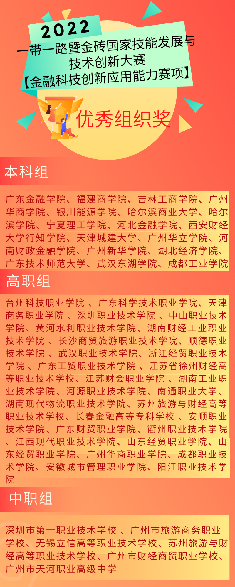 10月29日至30日,由金磚國(guó)家工商理事會(huì)、一帶一路暨金磚國(guó)家技能發(fā)展國(guó)際聯(lián)盟、中國(guó)科協(xié)一帶一路暨金磚國(guó)家技能發(fā)展與技術(shù)創(chuàng)新培訓(xùn)中心等機(jī)構(gòu)主辦;由金磚國(guó)家工商理事會(huì)技能發(fā)展工作組承辦;廣東財(cái)經(jīng)大學(xué)、長(zhǎng)沙商貿(mào)旅游職業(yè)技術(shù)學(xué)院、濟(jì)南旅游學(xué)校、深圳智盛信息技術(shù)股份有限公司共同承辦的2022年“一帶一路”金磚國(guó)家技能發(fā)展與技術(shù)創(chuàng)新大賽“金融科技創(chuàng)新應(yīng)用能力賽項(xiàng)”國(guó)內(nèi)總決賽采用線上的方式舉行。本次大賽分為本科、高職和中職三個(gè)賽道,吸引了來(lái)自全國(guó)190多所學(xué)校共760名選手參賽。